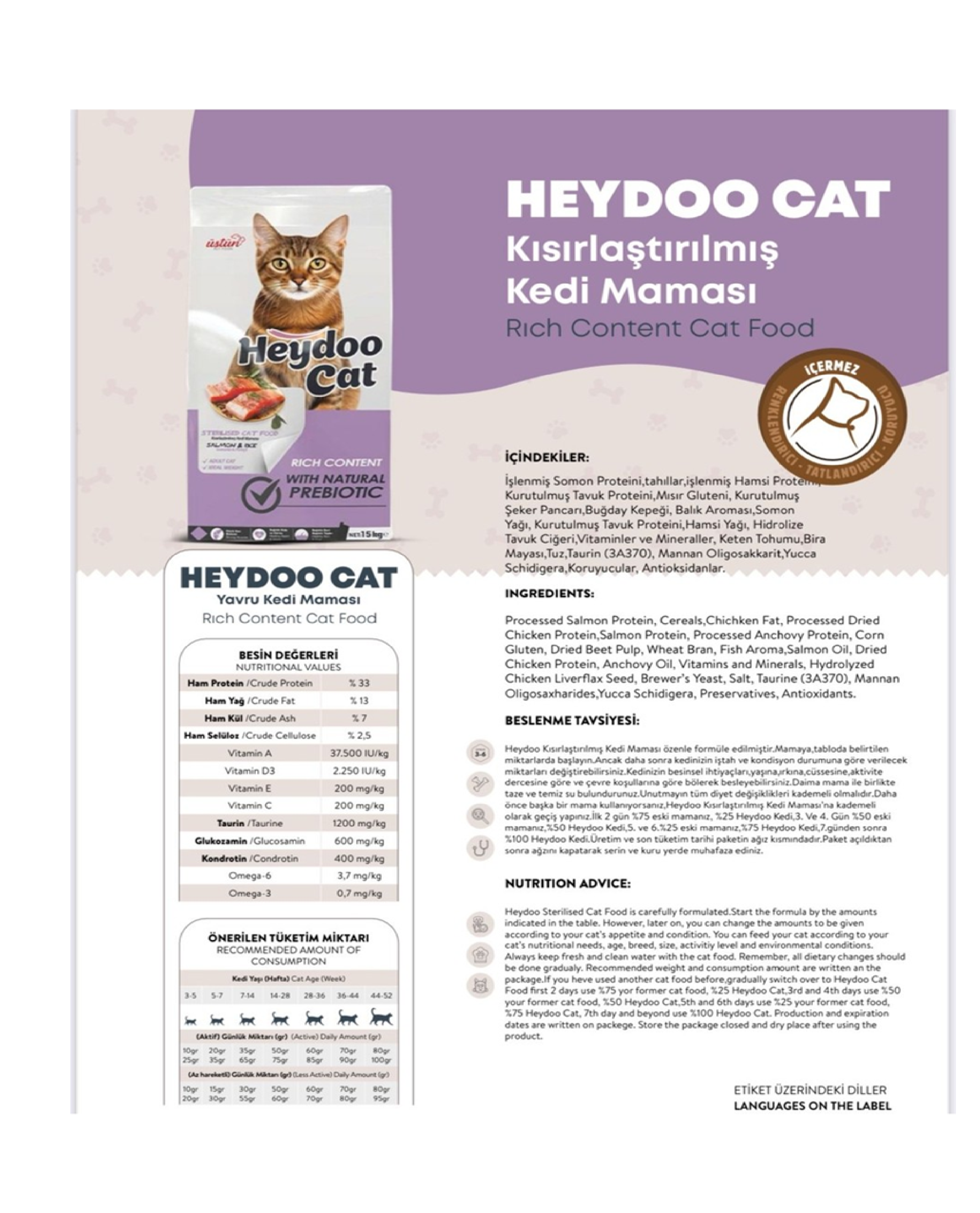 Heydoo Kısırlaştırılmış Kedi Maması özenle formüle edilmiştir.Mamaya,tabloda belirtilen miktarlarda başlayın.Ancak daha sonra kedinizin iştah ve kondisyon durumuna göre verilecek miktarları değiştirebilirsiniz.Kedinizin besinsel ihtiyaçları,yaşına,ırkına,cüssesine,aktivite dercesine göre ve çevre koşullarına göre bölerek besleyebilirsiniz.Daima mama ile birlikte taze ve temiz su bulundurunuz.Unutmayın tüm diyet değişiklikleri kademeli olmalıdır.Daha önce başka bir mama kullanıyorsanız,Heydoo Kısırlaştırılmış Kedi Maması’na kademeli olarak geçiş yapınız.İlk 2 gün %75 eski mamanız,%25 Heydoo Kedi,3. Ve 4. Gün %50 eski mamanız,%50 Heydoo Kedi,5. ve 6.%25 eski mamanız,%75 Heydoo Kedi,7.günden sonra %100 Heydoo Kedi.Üretim ve son tüketim tarihi paketin ağız kısmındadır.Paket açıldıktan sonra ağzını kapatarak serin ve kuru yerde muhafaza ediniz.