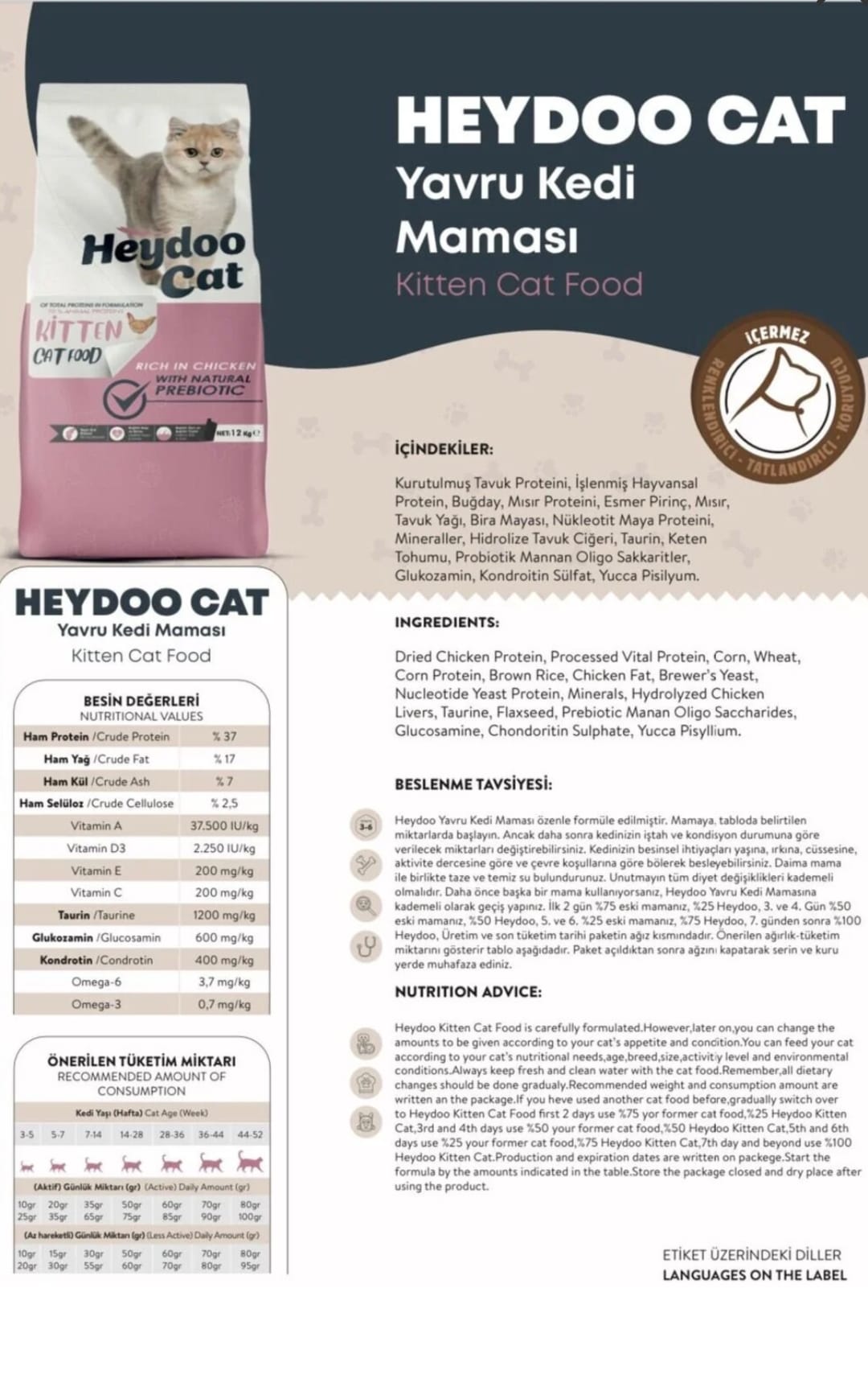 Heydoo Yavru Kedi Maması özenle formüle edilmiştir. Mamaya, tabloda belirtilen miktarlarda başlayın. Ancak daha sonra kedinizin iştah ve kondisyon durumuna göre verilecek miktarları değiştirebilirsiniz. Kedinizin besinsel ihtiyaçları yaşına, ırkına, cüssesine, aktivite dercesine göre ve çevre koşullarına göre bölerek besleyebilirsiniz. Daima mama ile birlikte taze ve temiz su bulundurunuz. Unutmayın tüm diyet değişiklikleri kademeli olmalıdır. Daha önce başka bir mama kullanıyorsanız, Heydoo Yavru Kedi Mamasına kademeli olarak geçiş yapınız. İlk 2 gün %75 eski mamanız, %25 Heydoo, 3. ve 4. Gün %50 eski mamanız, %50 Heydoo, 5. ve 6. %25 eski mamanız, %75 Heydoo, 7. günden sonra %100 Heydoo, Üretim ve son tüketim tarihi paketin ağız kısmındadır. Önerilen ağırlık-tüketim miktarını gösterir tablo aşağıdadır. Paket açıldıktan sonra ağzını kapatarak serin ve kuru yerde muhafaza ediniz.